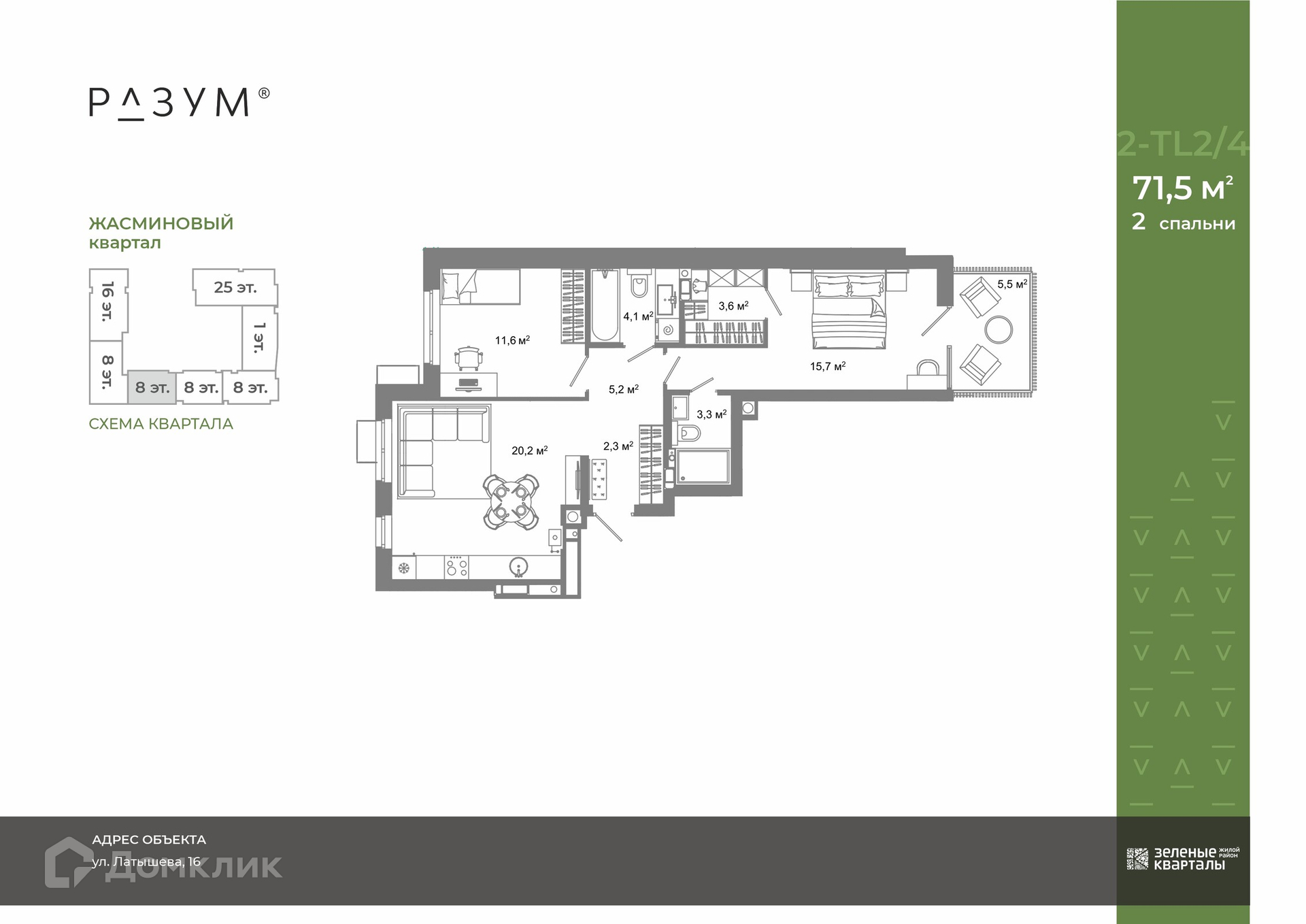 «Зеленые кварталы» — первый жилой район от компании «РАЗУМ», создателя «Сердце Каспия» и «НАСЛЕДИЕ» в Астрахани, состоящий из пяти зелёных кварталов, объединенных общим бульваром. Жилой район расположен в центре университетской жизни Астрахани. Рядом находятся детские сады, школы, Центральный стадион, досуговые и развивающие центры и большая прогулочная зона вдоль Комсомольской набережной. Общая площадь благоустройства проекта — 7 гектаров. Главная особенность проекта — переменная этажность домов от 8 до 25 этажей. Жасминовый квартал — территория изысканности с 2 уровнями благоустройства территории. Первый уровень — свой двор-парк. Это благоустроенная придомовая территория с дендропарком, в котором деревья и кустарники высажены с учетом всех четырех сезонов. Второй уровень — просторный бульвар протяженностью 270 м, объединяющий все кварталы в единой целое. «Зеленые кварталы» — это - территория без машин; - безбарьерная среда; - единый экостиль в оформлении дворовых пространств в соответствии с названием квартала; - 24 тематические зоны на бульваре: пространства для отдыха и релакса с гамаками и шезлонгами, центральная площадь с амфитеатром и контактным фонтаном, 2 зоны work-out, детские игровые площадки, разделенные по возрастам, тарзанка, водные и скалолазные конструкции, песочницы, батуты; - велодорожка длиной 1200 м, проходящая через весь жилой район и ПЕРВОЕ в Астрахани велокафе; - детский сад на 125 мест на территории района и рассчитан 5 групп разного возраста; - площадка для выгула собак; - многоуровневое освещение и подсветка фасадов; - видеонаблюдение; - эстетичные подъездные холлы со сквозными подъездами и комфортной зоной ожидания. В проекте представлены 107 планировочных решений: от уютных студий 31,1 м² до квартир с тремя спальнями и кухней-гостиной 128 м² с функциональным разделением на гостевую и приватные зоны. Для воплощения самых смелых дизайнерских решений есть эксклюзивные квартиры с собственной террасой от 6 м² до 34 м².