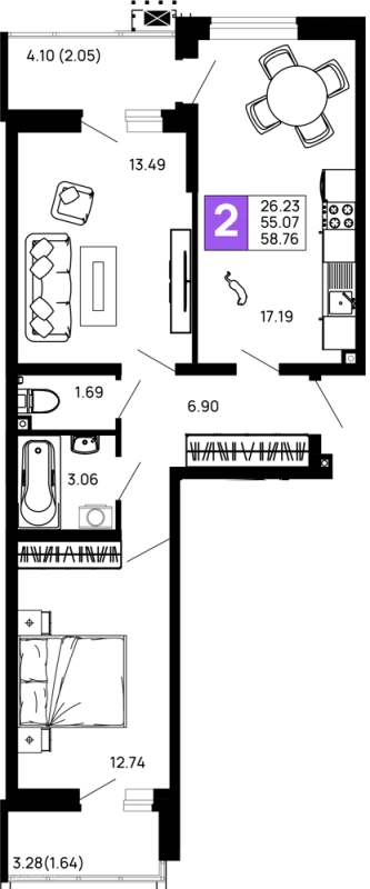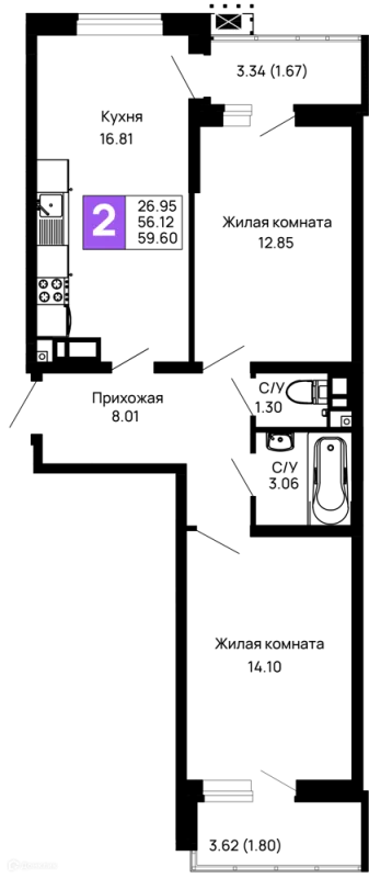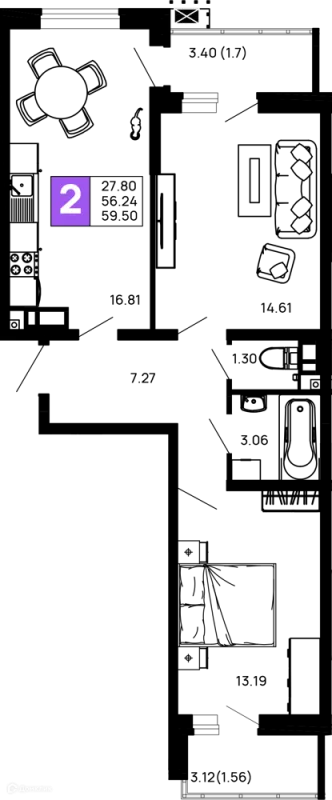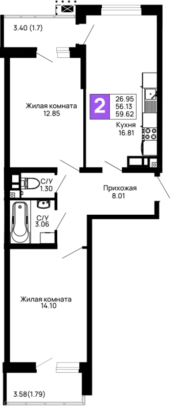 56.96 м²